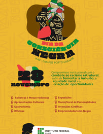 O Dia da Consciência Negra no IFAP Campus Porto Grande é um evento que reforça o compromisso institucional com o combate ao racismo estrutural, além de fomentar a inclusão, a equidade racial e a criação de oportunidades. A celebração também busca sensibilizar a comunidade sobre o respeito à diversidade e a valorização das identidades, abordando de forma ampla e multidimensional aspectos como as artes, inovações científicas, personalidades históricas, gastronomia e cultura amapaense, entre outros