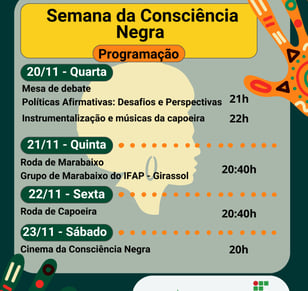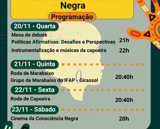 No dia 22/11, ocorreu a palestra “Desafios de manutenção cultural na contemporaneidade dentro de instituições de ensino” com Professor Roberto Campos, apresentação de instrumentalização e músicas de capoeira e roda de capoeira sob responsabilidade do professor Roberto Campos, apresentação do grupo “Herança Ancestral” com performance e jogo de maculelê, ocorrerá no pátio (área de convivência); concomitantes palestras “Dinâmica: Sensibilização através de práticas interativas sensoriais inclusivas: se colocar no lugar do outro” com a professora Edilany Vales e a palestra “Consciência Negra e Inclusão: Desafio em dobro para os negros com deficiência no Brasil” com professor Jorge Lucas.