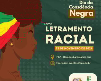 Estão abertas as inscrições para participar da programação do Dia da Consciência Negra/IFAP - campus Laranjal do Jari; que tem este ano como tema: Letramento Racial. Serão diversas atividades entre palestras, oficinas, mesas-redondas, minicursos e manifestações artístico-culturais, abertas para toda a comunidade